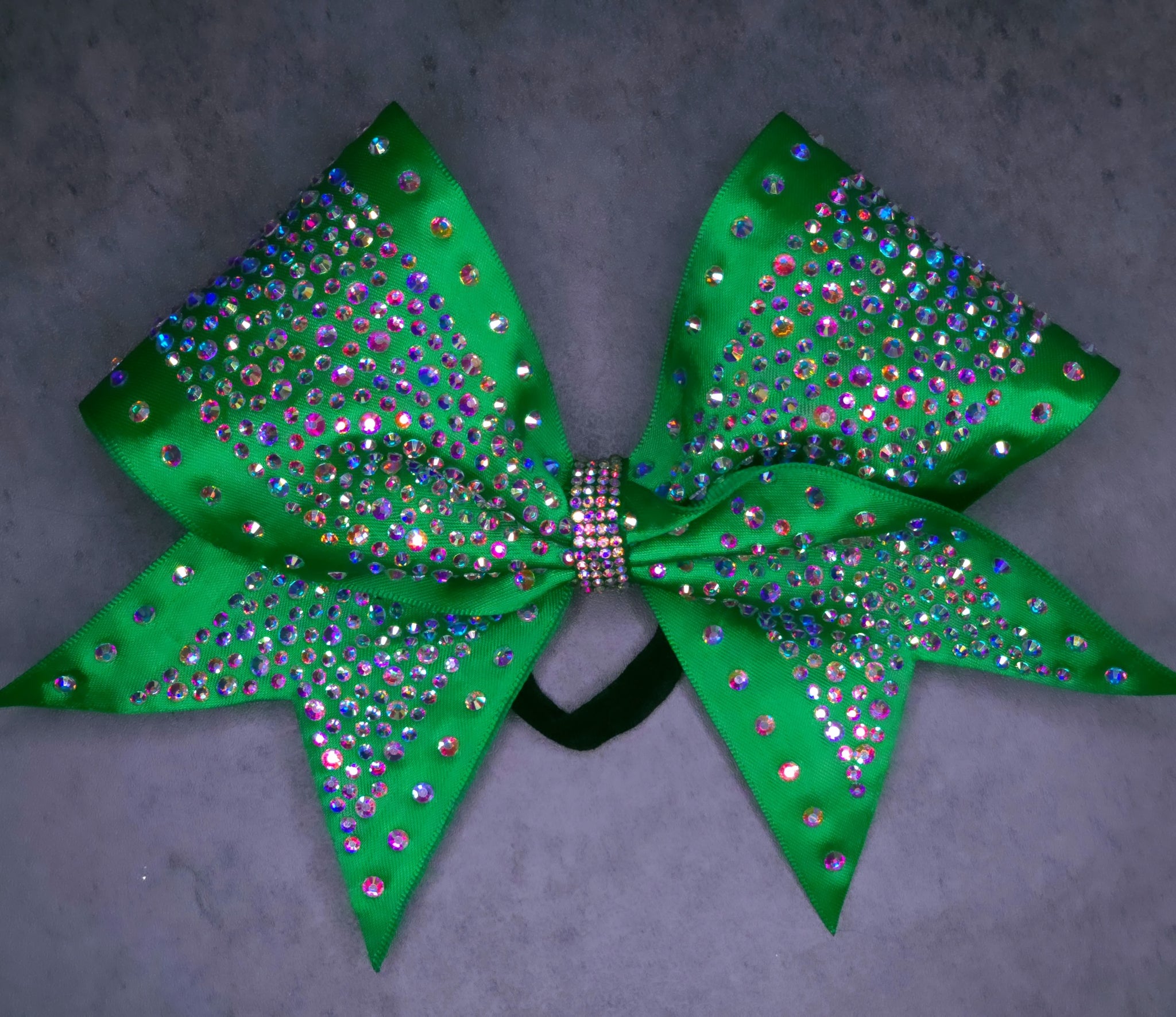 This bow features a diamond pattern of AB rhinestones on a satin base.
