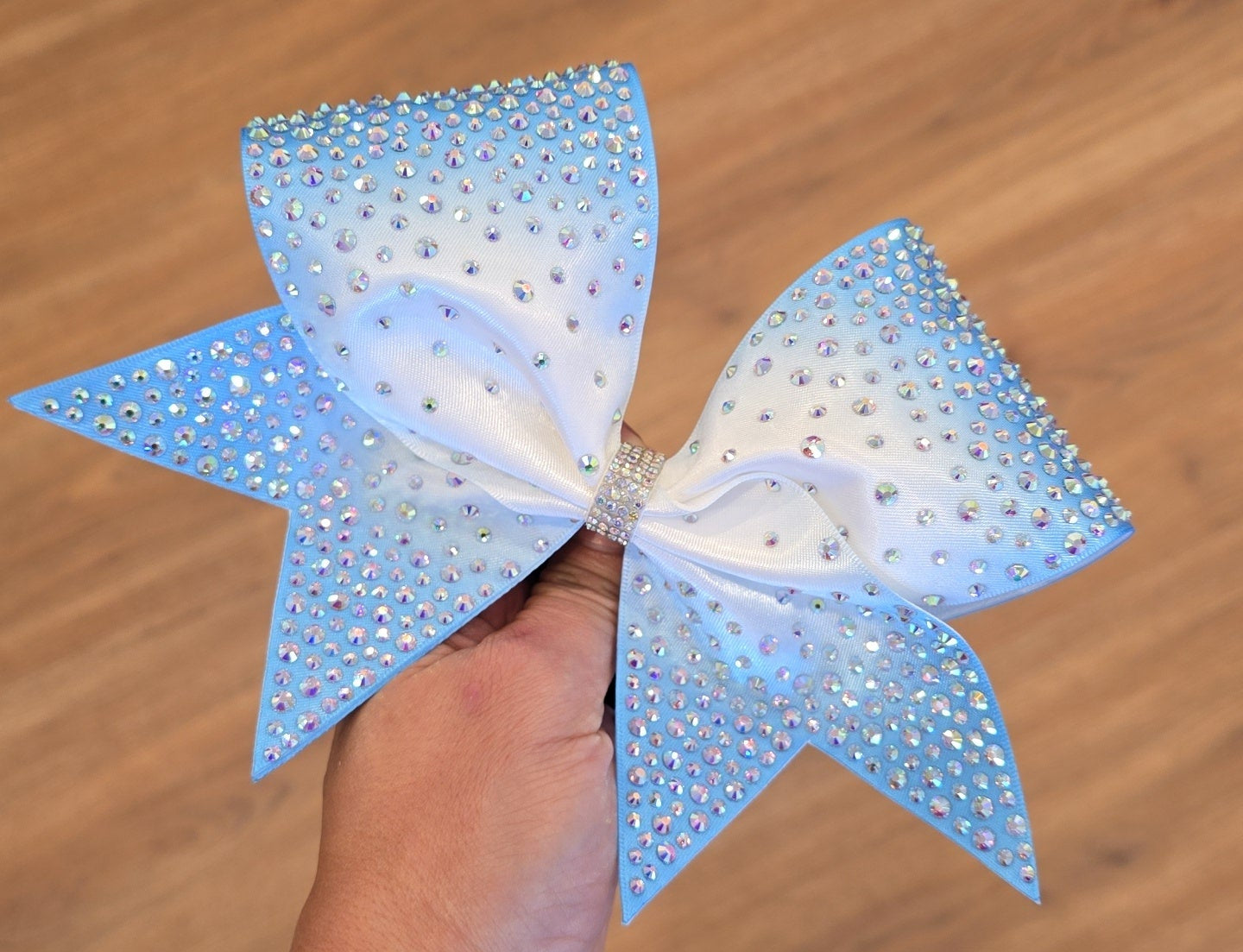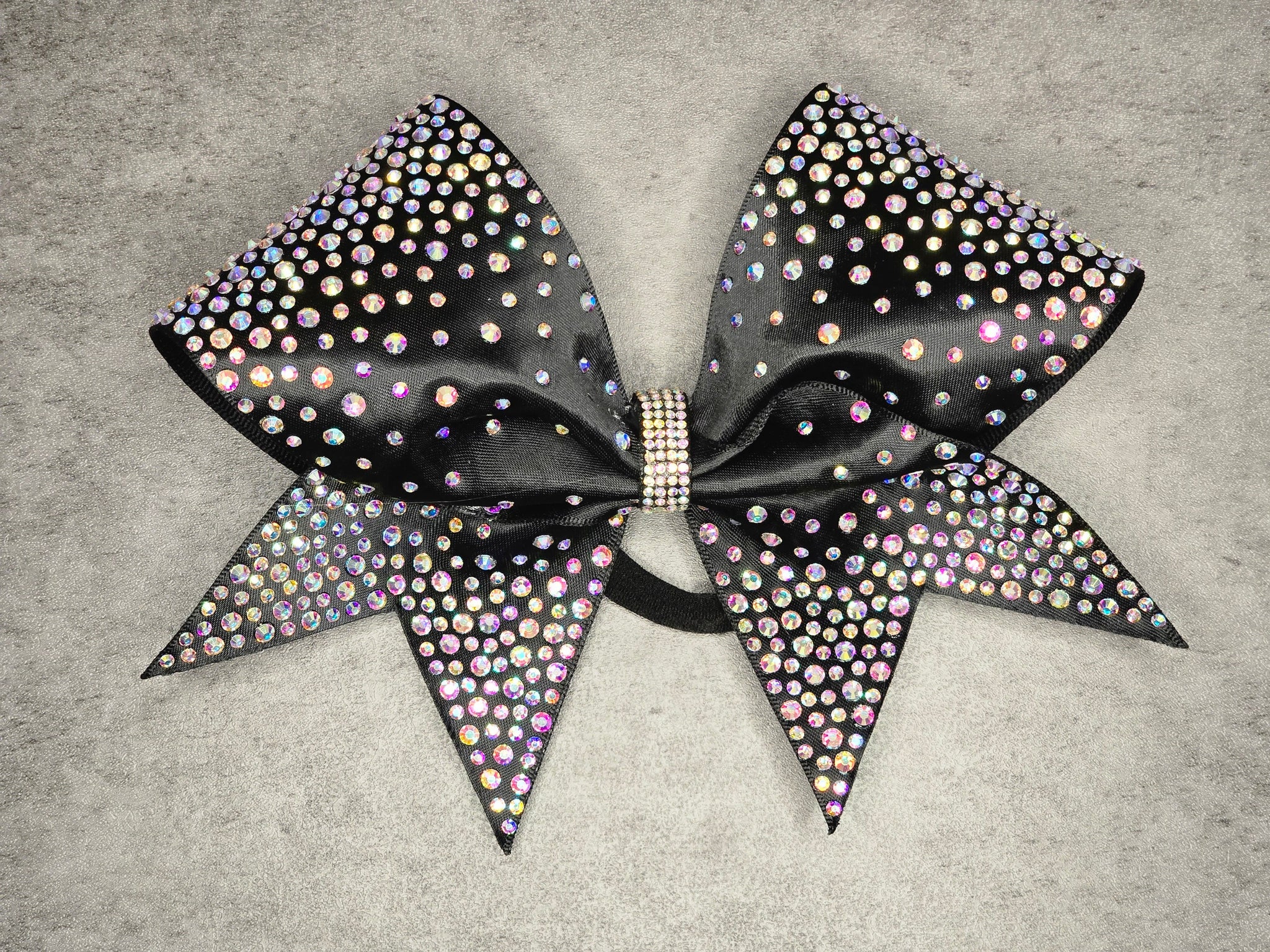 This bow is an ombre scatter of two sizes of AB rhinestones on a satin base.